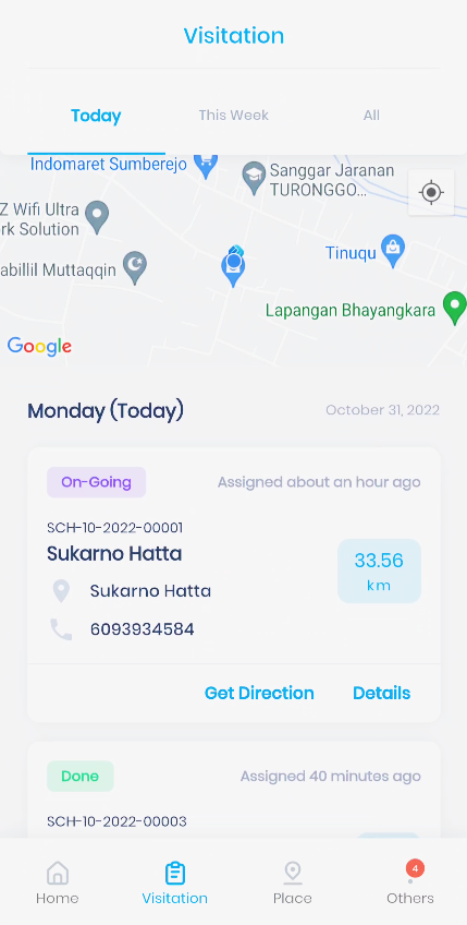 In each visitation, there is a list in the form of a card: Visitation status, when the visit was made, company name, company address, company phone number, company distance, get direction button, and details.
